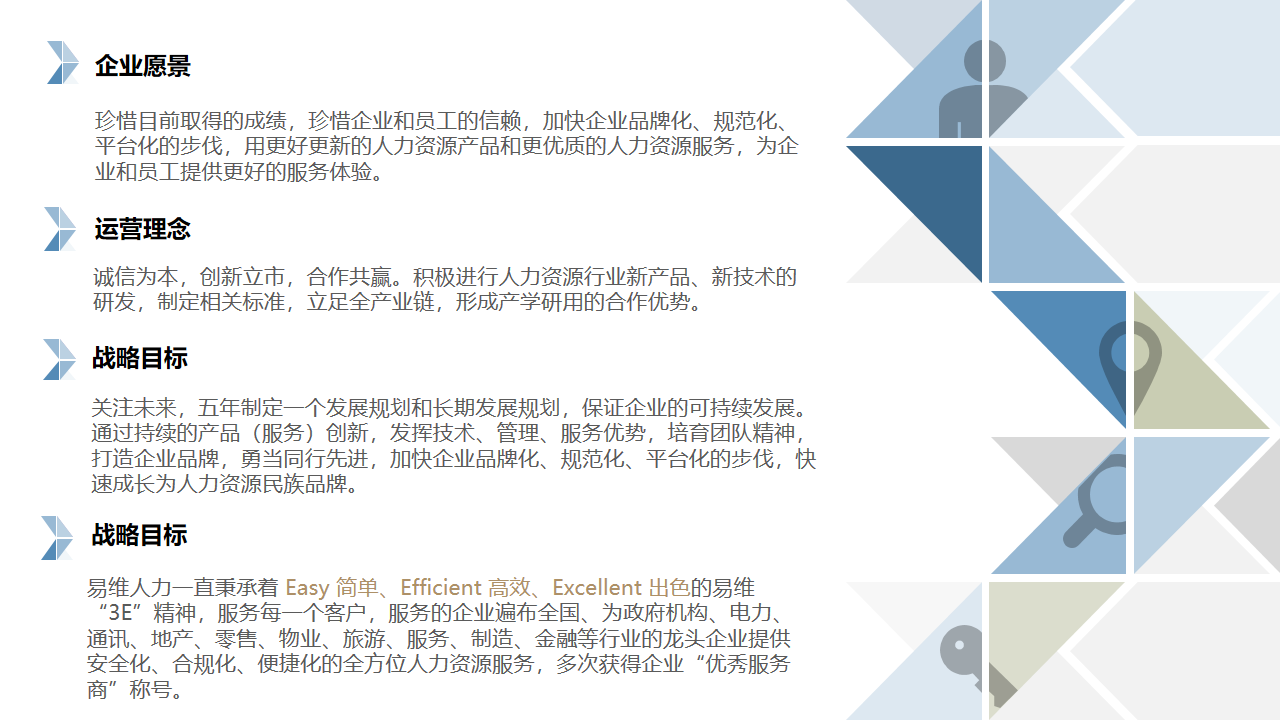 易維人力一直秉承著 Easy 簡單、Efficient 高效、Excellent 出色的易維“3E”精神,服務每一個客戶,服務的企業遍布全國、為政府機構、電力、通訊、地產、零售、物業、旅游、服務、制造、金融等行業的龍頭企業提供安全化、合規化、便捷化的全方位人力資源服務,多次獲得企業“優秀服務商”稱號。